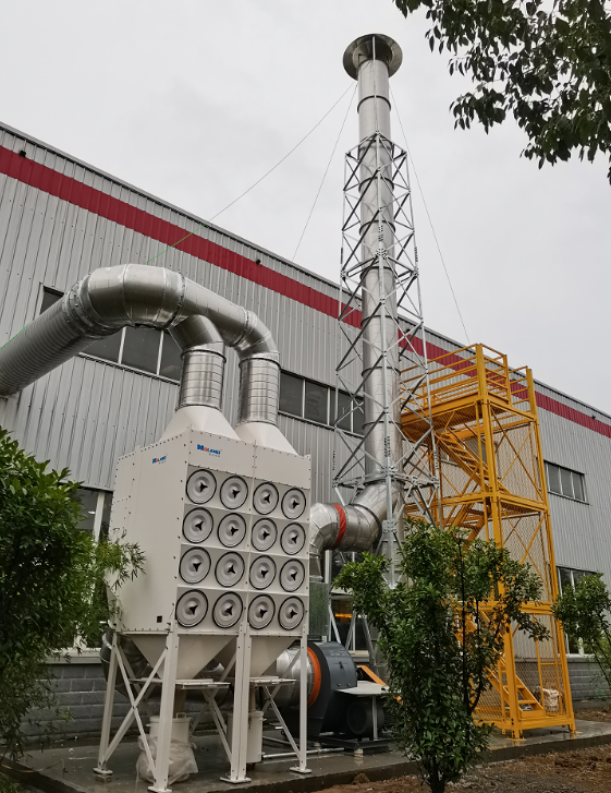 根據現場車間布局,將煙塵凈化器主機、風機放置在車間外部平臺上;獨立電控裝置放置在車間內便于除塵系統啟停操作。