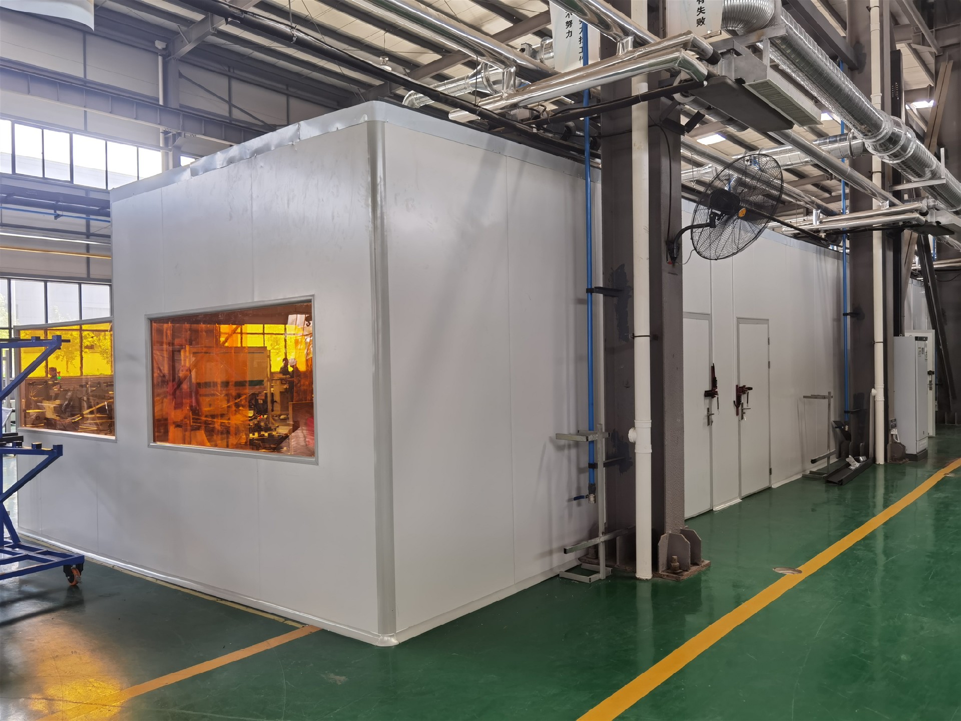 現場車間共有8個焊接工作站需要煙塵凈化處理,在焊接工裝平臺中心處,安裝遮擋弧光的軟膠簾,膠簾從離地面2米高度垂下,膠簾下擺根據工裝平臺的形狀仿形剪切,下擺距離工裝或地面縫隙不大于10mm,膠簾交錯層疊安裝,兩條膠簾之間的層疊區長度不低于30mm;使焊房處于相對密閉的空間,焊接煙塵不外溢。各焊房上料區之間安裝隔斷墻,隔斷墻腰線高度1米,腰線以下采用凈化板材質,腰線以上采用金屬框架和半透明擋光材料。各焊房上料區有獨立的空間,并且保證了外觀的整齊劃一。