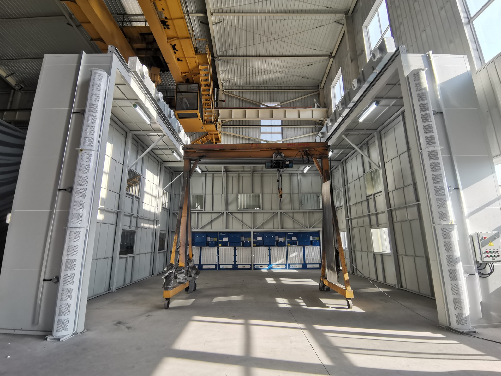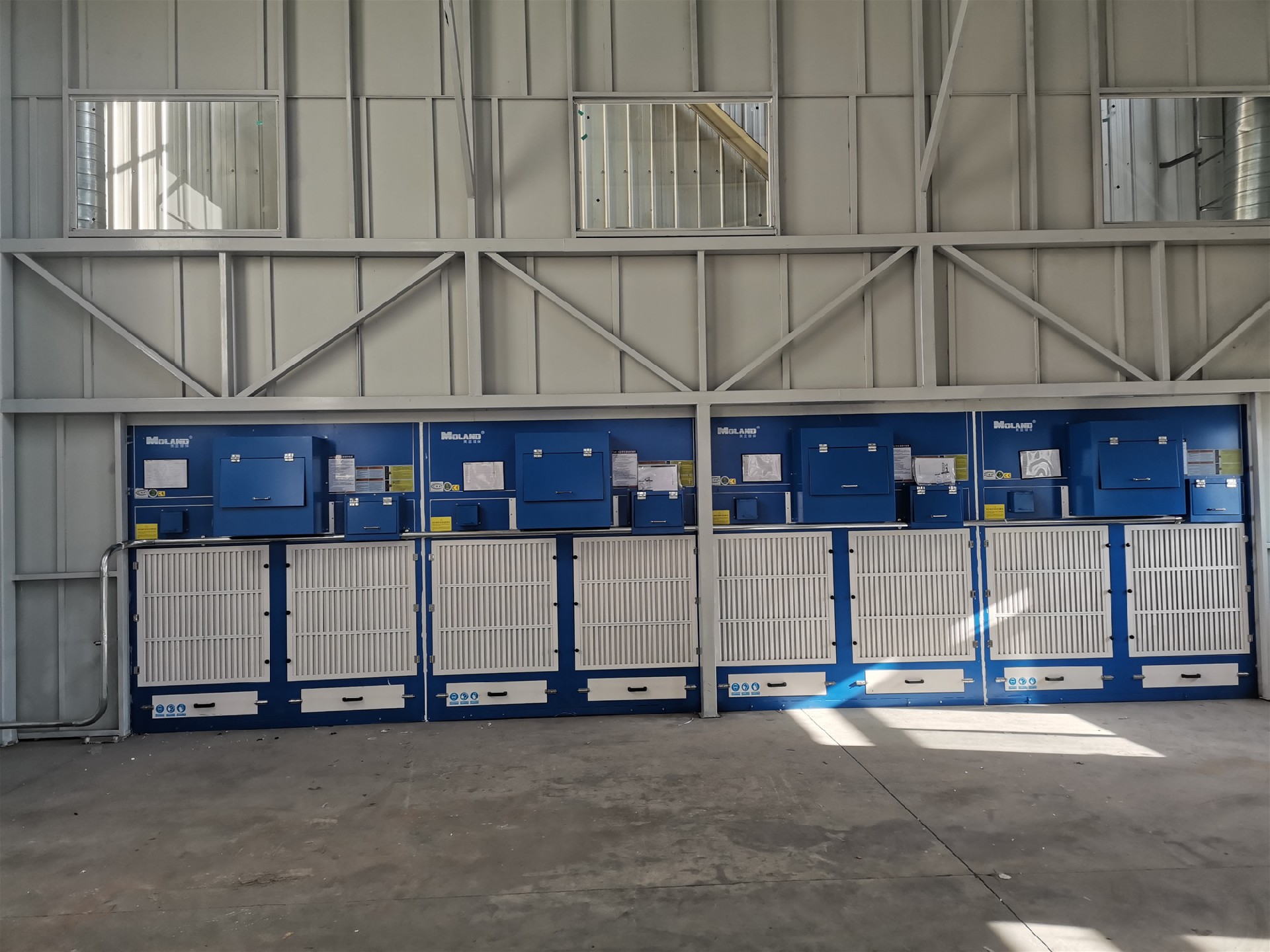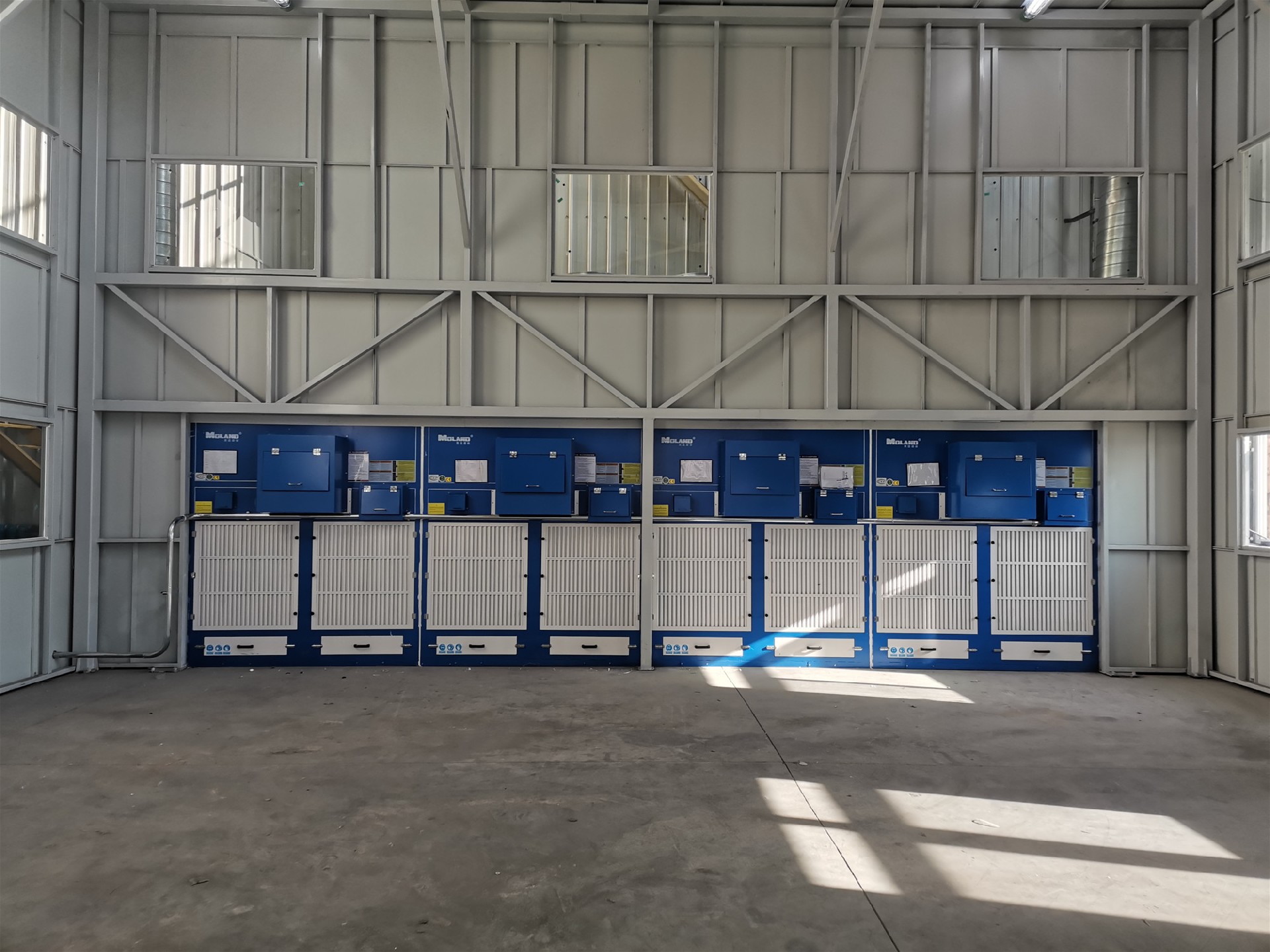 科技美藍(lán),智慧除塵,大家好,今天給大家分享大型工件打磨拋光產(chǎn)生的粉塵怎樣處理?這是我們?yōu)槟衬茉囱b備生產(chǎn)企業(yè)鈦合金打磨車間設(shè)計(jì)制作的防爆無(wú)塵打磨除塵系統(tǒng),客戶現(xiàn)場(chǎng)打磨工件比較大,需要行車吊裝工件,且打磨時(shí)粉塵量比較大,了解具體工況及跟客戶溝通后,采用美藍(lán)環(huán)保4臺(tái)防爆款打磨除塵柜+打磨房的處理方式,打磨房尺寸10m(長(zhǎng))*10m(寬)*6m(高),鋼結(jié)構(gòu)整體框架,防腐蝕龍骨搭建,板材選用碳鋼噴塑鈑金材質(zhì),在房頂兩側(cè)加裝送風(fēng)管道,凈化后的空氣通過管道進(jìn)入射流口吹到房間里,實(shí)現(xiàn)空氣內(nèi)循環(huán)。并在房頂加裝一個(gè)可伸縮的電動(dòng)天幕,吊裝工件的時(shí)候收縮,作業(yè)的時(shí)候可打開覆蓋房間。為達(dá)到良好的送風(fēng)效果,在門口兩側(cè)各加裝風(fēng)幕,形成一個(gè)無(wú)形的門簾,防止粉塵不外溢。
